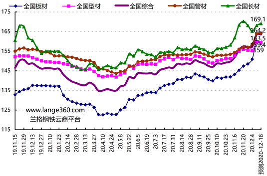 2020年第50周(2020.12.7-12.11)兰格钢铁全国钢材综合价格指数达到163.4点,较上周上升3.88%,较去年同期上升9.69%。其中,LGMI长材价格指数为168.1点,较上周上升1.79%,较去年同期上升4.20%;LGMI型材价格指数为159.4点,较上周上升2.64%,较去年同期上升4.65%;LGMI板材价格指数为160.0点,较上周上升6.04%,较去年同期上升16.62%;LGMI管材价格指数为163.8点,较上周上升3.31%,较去年同期上升5.35%。