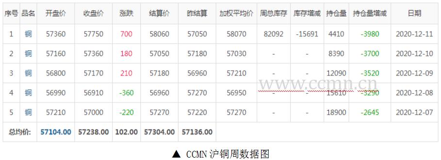 12月11日当周,国内现货铜价高位震荡。长江有色金属网1#铜均价报57338元/吨,日均上涨154元/吨,周线上涨1.34%;此前一周均价报57360元/吨,与上周相比下跌22元/吨,环比下跌0.04%。