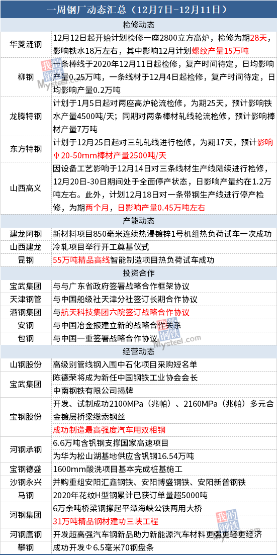 据Mysteel不完全统计,本周(12月7日-12月11日)有5家钢厂发布检修动态,具体如下: