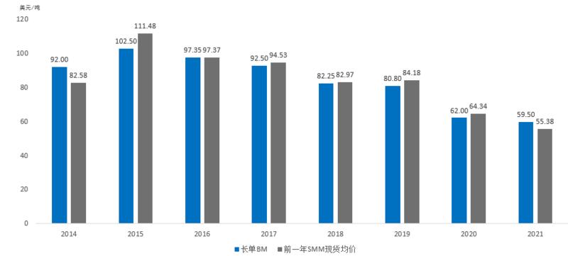 历年长单加工费Benchmark与前一年SMM铜精矿TC现货均价对比