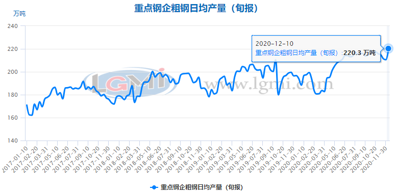 据中国钢铁工业协会统计数据显示,2020年12月上旬重点钢企粗钢日均产量220.25万吨,旬环比增加9.68万吨,上升4.6%,同比增长11.97%。