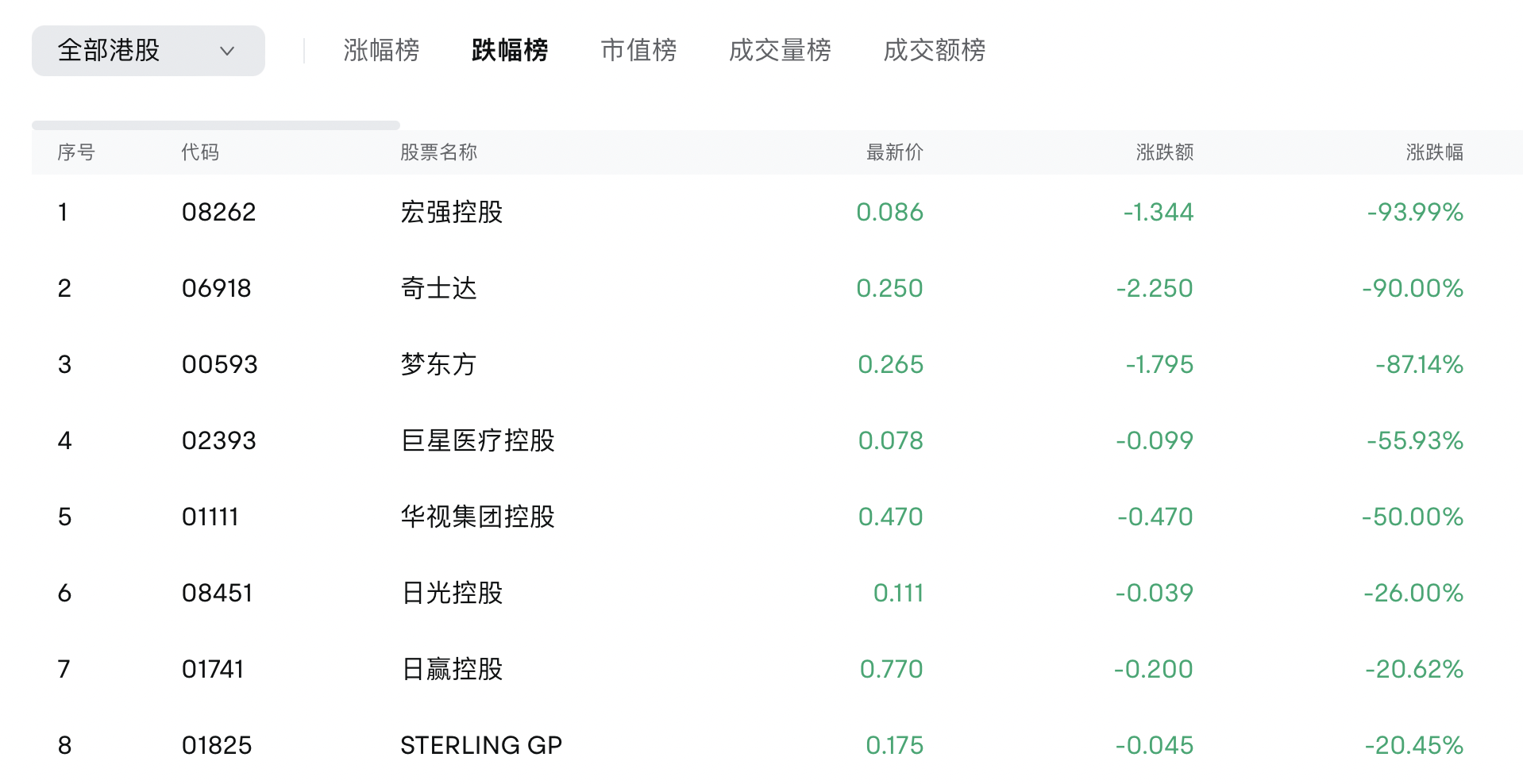 不过,多只“仙股”及新上市不久股份跌幅惊人,其中,宏强控股跌近94%,暂时停牌;奇士达跌90%,成交额激增至2.16亿港元,市值1.59亿港元;梦东方跌87.14%;上市不足两月的华视集团跌50%;巨星医疗跌55.93%,股价仅为0.0878港元,创上市以来新低。