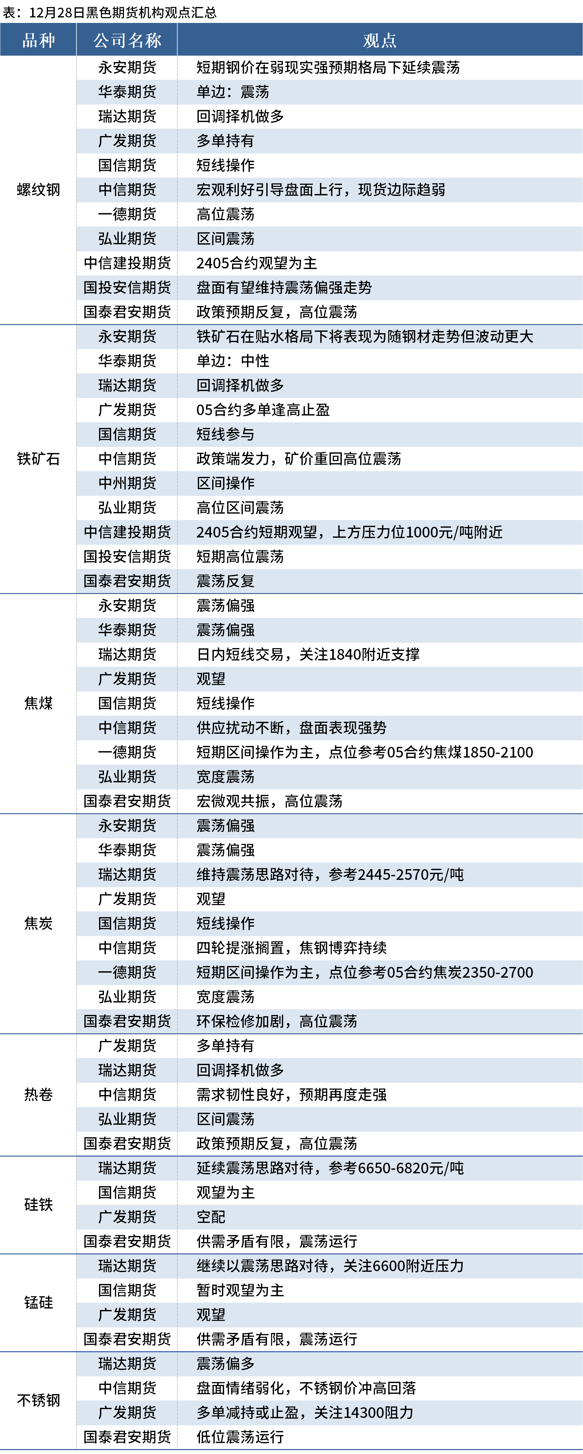 据Mysteel统计12月28日11家期货机构操作策略,其中多数机构料螺纹钢震荡运行,铁矿石震荡运行,焦煤、焦炭震荡偏强。具体汇总内容如下: