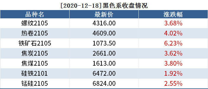 截至12月18日收盘,螺纹2105收4316,涨3.68%;热卷(4609, 178.00, 4.02%)2105收4609,涨4.02%;铁矿(1074, 63.00, 6.23%)石2105收1037.5,涨6.23%。各品种具体如下: