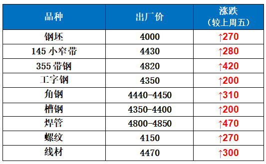12月21日钢坯出厂价继续上调,创下年内最新高,唐山钢坯直发价格报4000元/吨,较上周五涨270元/吨,仓储现货含税报价在4110-4130元/吨之间,高位成交并不多。唐山小窄带出厂价涨80元/吨,成交情况良好,基本出清日产。唐山型材价格继续上涨,涨后高位成交减缓,仅个别有开张。唐山地区建材市场价格加速上涨,期螺钢(4460, 212.00, 4.99%)坯加速赶顶,厂家积极推涨,市场观望多成交少。