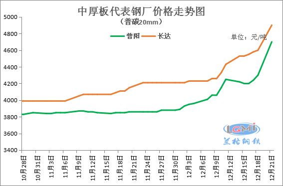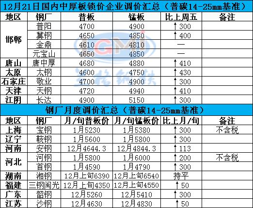 12月21日国内中厚板市场价格暴力拉涨,据兰格云商平台监测数据显示,国内重点城市16-25mm普板平均价格为4737元,较上个成交日涨362元,较上周同期上涨461元,较上月同期上涨755元。现主导城市方面,邯郸4660元,较上周五累涨370元;天津4740元,较上周五累涨430元;广州4960元,较上周五累涨320元;上海4770元,较上周五累涨300元。钢厂锁价方面,普阳、敬业4700元,较上周五上调300元;元宝上、冀钢4650元,较上周五上调400元;天钢4720元,较上周五上调410元;唐中厚4680元,较上周五上调410元;太钢4600元,较上周五上调430元;长达4900元,较上周五上调300元;钢厂锁价也均呈现暴力上调。