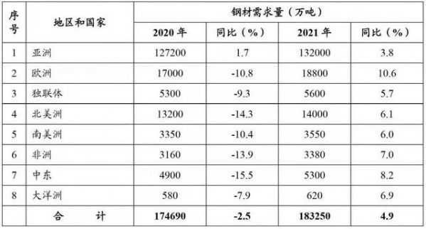 (2020年和2021年全球主要地区钢材需求预测情况)
