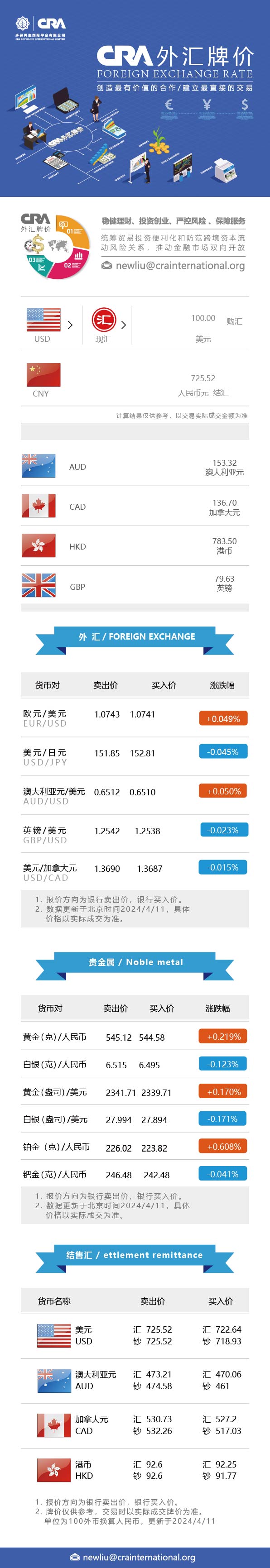 4月11日CRA贵金属及外汇市场价