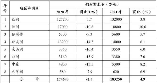 2020年和2021年全球主要地区钢材需求预测变化情况见下表。