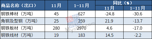 11月,我国出口钢铁棒材45万吨,同比下降24.8%;1-11月累计出口627万吨,同比下降30.6%。其他进出口情况如下表所示: