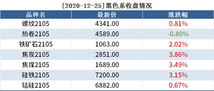 截至12月25日收盘,螺纹2105收4341,涨0.81%;热卷(4589, -37.00, -0.80%)2105收4589,跌0.80%;铁矿(1063, 21.00, 2.02%)石2105收1063,涨2.02%。各品种具体如下: