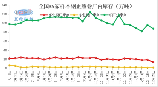 钢厂库存较上周增加:目前全国35家钢企热卷厂内库存88万吨,较上周减少8万吨。其中华北11家钢企热卷厂库13.6万吨,周减5.1万吨;东北4家钢企热卷厂库1.45万吨,周增3.5万吨。