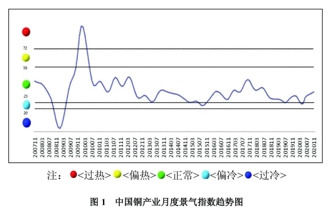 2020年11月,中国铜产业月度景气指数持续回升,位于“正常”区间中下部运行。中国铜产业月度景气指数变化趋势如图1所示。