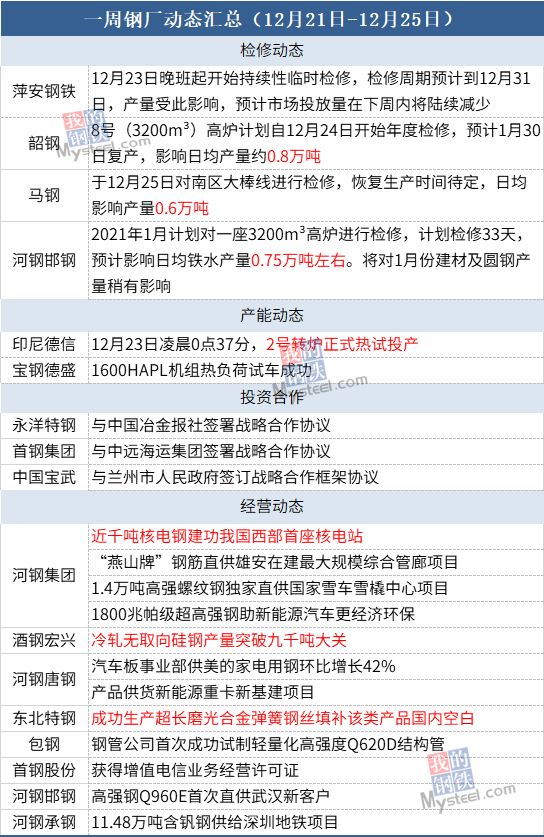 据Mysteel不完全统计,本周(12月21日-12月25日)有4家钢厂发布检修动态,具体如下: