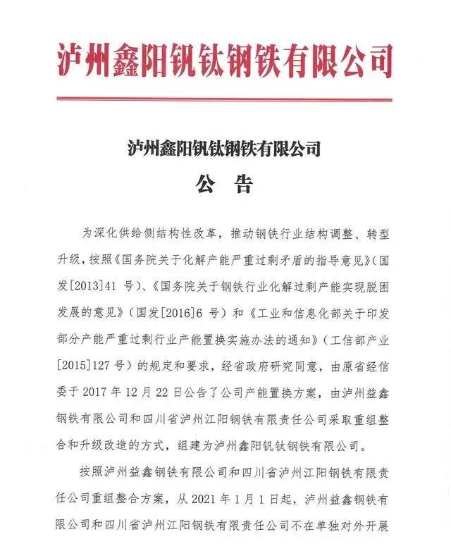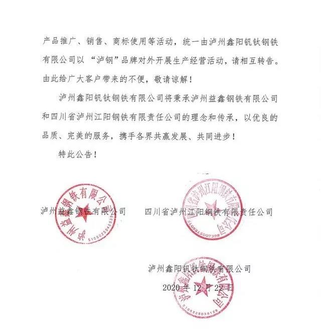 从2021年1月1日起,泸州益鑫钢铁有限公司和四川省江阳钢铁有限责任公司不再单独对外开展产品推广、销售、商标使用等活动,统一由泸州鑫阳钒钛钢铁有限公司以“泸钢”品牌对外开展生产经营活动。
