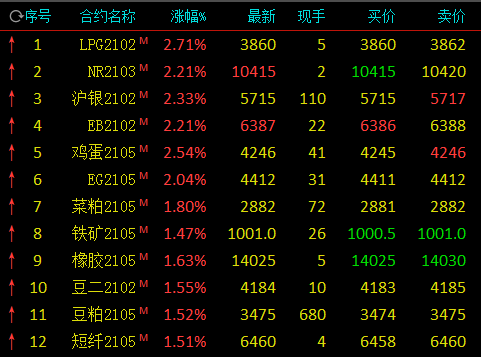 1月4日,国内期市开盘,沪银涨逾2%,LPG、苯乙烯、乙二醇涨逾2%,鸡蛋(4241, 100.00, 2.41%)涨逾2%。