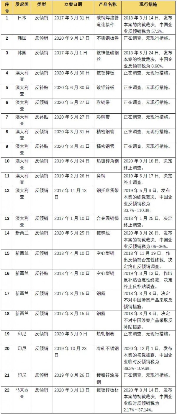 下表为2017-2020年RCEP国家对华钢铁及其制品发起贸易救济调查统计表: