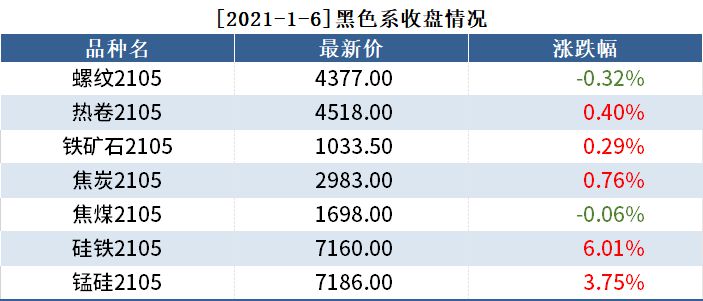 截至1月6日收盘,螺纹2105收4377,跌0.32%;热卷(4518, 18.00, 0.40%)2105收4518,涨0.40%;铁矿(1034, 3.00, 0.29%)石2105收1033,涨0.29%。