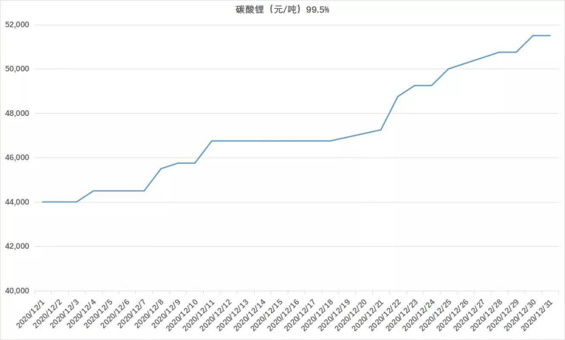 市场数据显示,自10月起,国内电池级碳酸锂价格开始出现回调。截止2020年12月31日,电池级碳酸锂均价上涨至51500元/吨,涨幅约30%,较12月1日上涨7500元/吨,反弹17%。