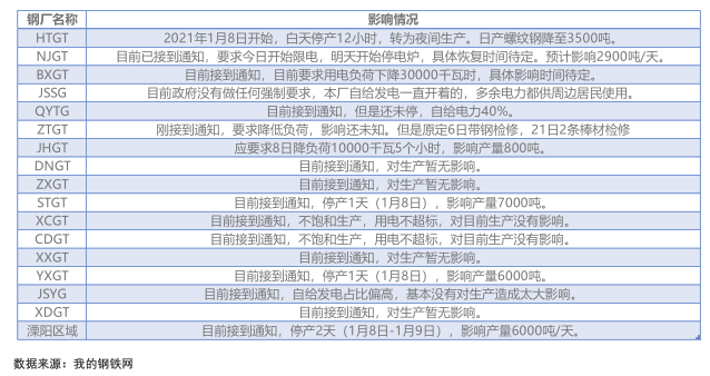 3、近日Mysteel统计十余家钢厂均接到限电通知,但半数企业表示用电不超标,对当前生产暂无明显影响。其余企业则以降负荷生产、晚班生产或临时检修等方式落地执行。另外,目前限电的最大原因,应该是寒潮带来的用电大幅增长,造成电力系统负荷较高,只要后期气温回升,电力紧张应该会有所缓解,本次限电可能影响有限;