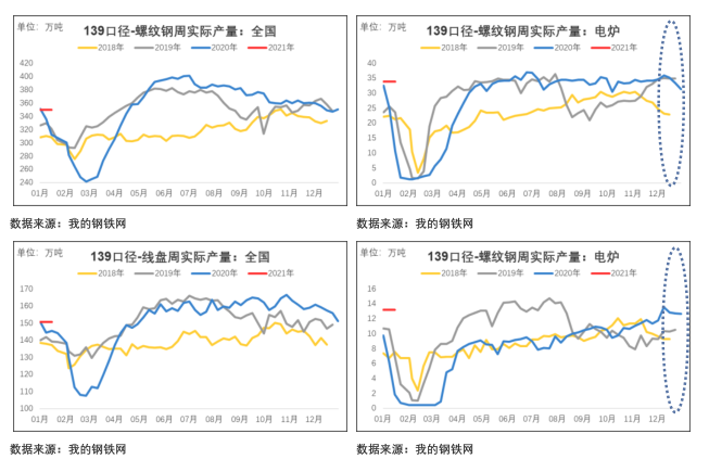 2020年12月第三周(2020年12月14日-2020年12月20日)传出的浙江、江西湖南等部分省份于近日陆续发布有关“双控”、“有序用电”的通知,多年不见的“拉闸限电”再现,当期螺纹钢产量348.95万吨,线盘产量157.3万吨,但当时从接收到消息至当期数据发布的时间周期内,我网调研了解到当时尚未对钢企生产有明显影响。