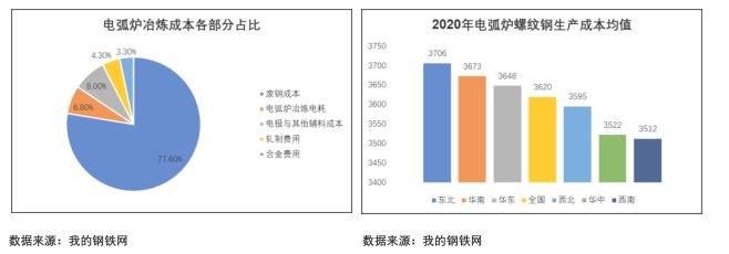 众所周知,电弧炉冶炼即利用电极电弧产生的高温熔炼矿石和金属的电炉,气体放电形成电弧时能量很集中,弧区温度在以上。目前中国独立电弧炉炼钢成本大致可以分为废钢成本、电弧炉冶炼电耗、合金费用、轧制费用、电极和其他辅料成本。以主要品种螺纹钢为例,中国主流区域电弧炉生产螺纹钢品种主要电耗约占总成本的,是除废钢成本外的第二大电弧炉冶炼成本。