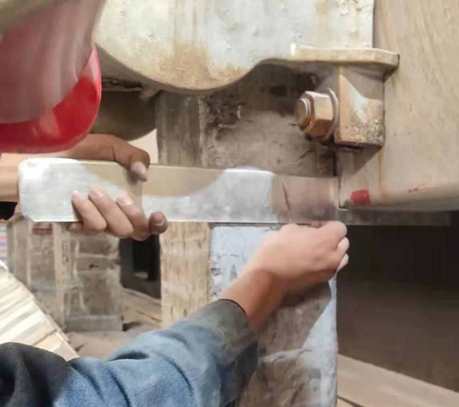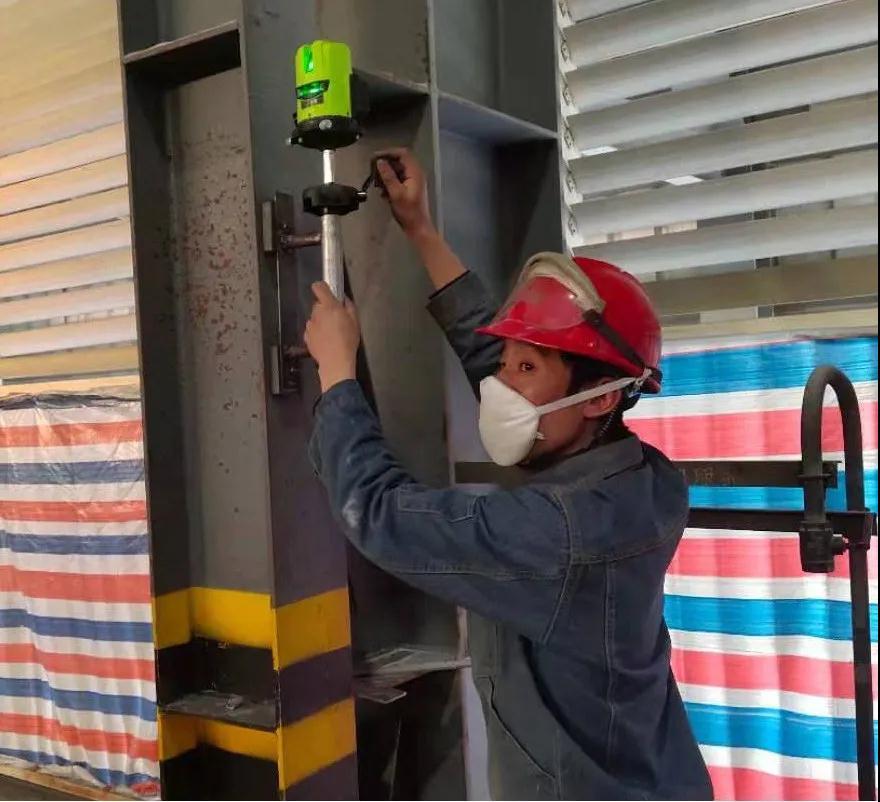 我公司自投产以来,新极定位均采用兜尺划线的方法,但是兜尺在不同人员操作甚至同一人操作不同时间,由于兜尺本身存在较明显的变形量,误差较大。