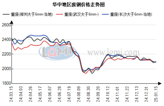 1月15日华中废钢市场价格主稳运行。据兰格钢铁网监测数据显示,郑州地区重废市场报价2100元,较上个交易日价格持平,长沙地区重废市场报价在2090元,较上个交易日价格持平,武汉地区重废市场报价在2100元,较上个交易日价格持平。