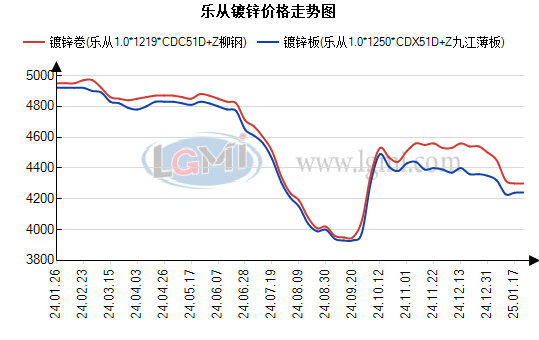 乐从镀锌价格主稳运行。据兰格钢铁云商平台监测数据显示,现镀锌1.0mm价格:柳钢4300元,九江薄板4240元,含税。