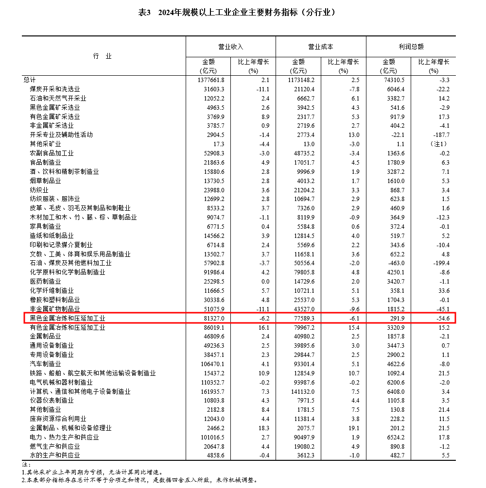2024年,黑色金属冶炼和压延加工业实现利润总额291.9亿元。
