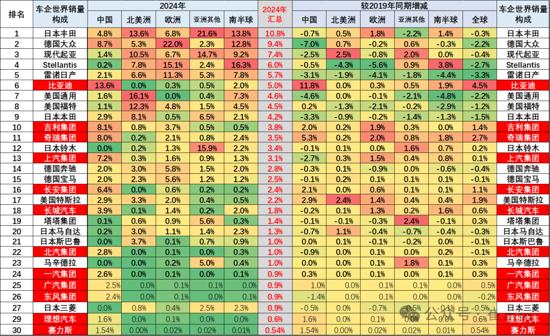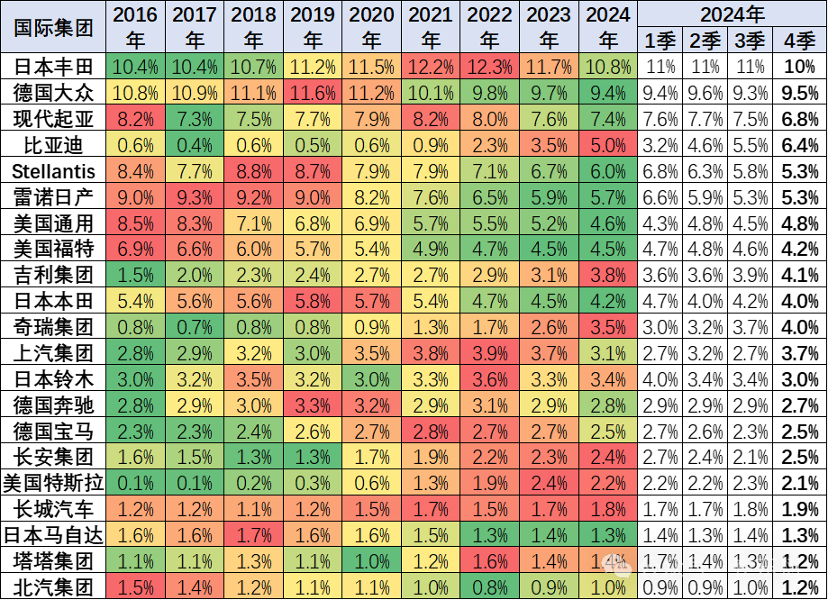 丰田集团表现相对较强,较2019年下降0.3个百分点,2024年在世界份额保持在10.8%左右的水平,这也是因为丰田在欧洲和北美市场总体表现较强。