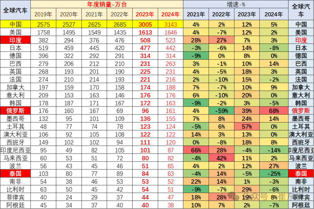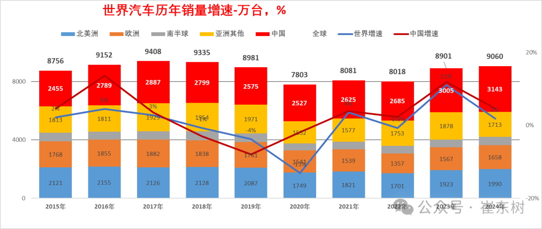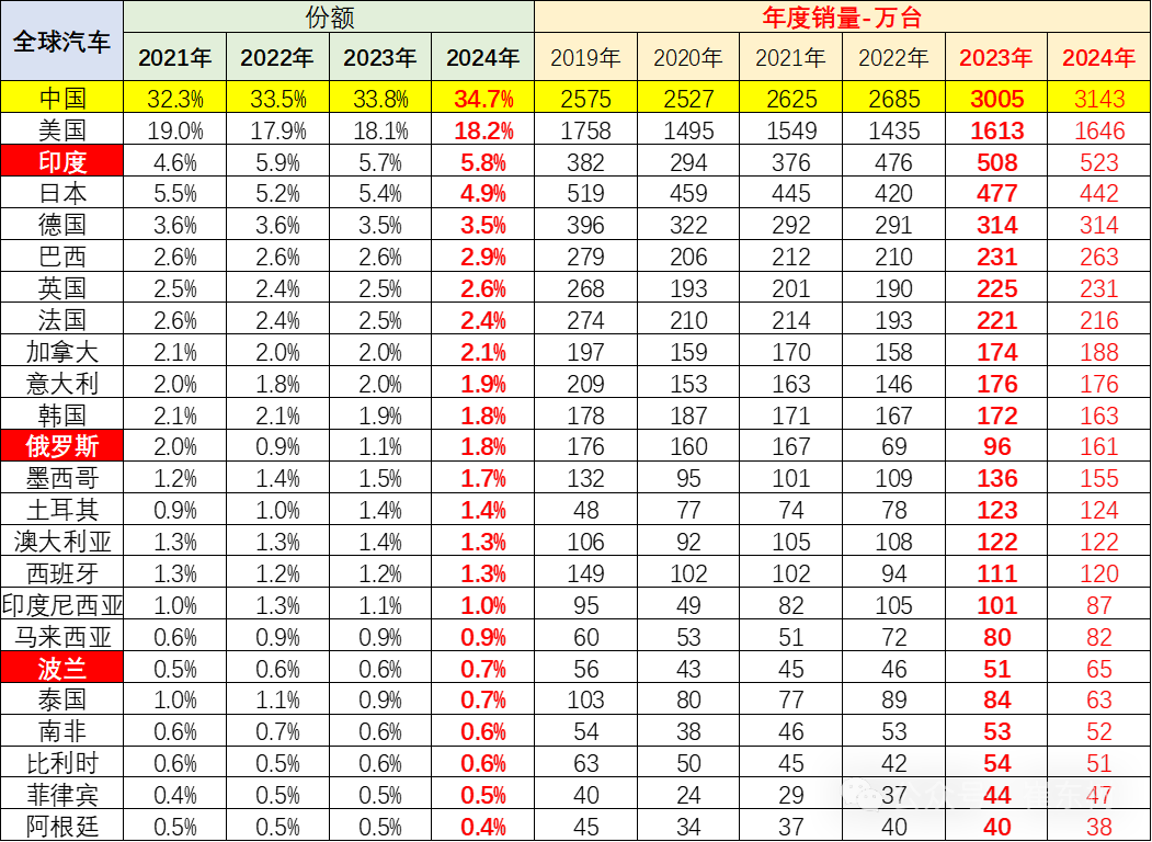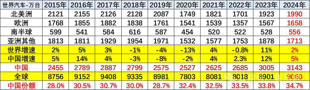 随着政策刺激效果显现,中国2024年达到世界汽车的34.7%的份额,这主要因下半年中国车市走强。今年北欧洲市场份额全面回升,南半球市场走势较强。