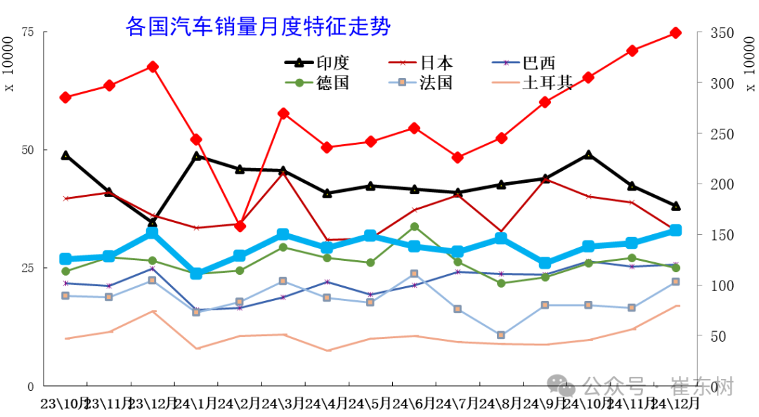 由于中国车市仍是普及期,呈现年初年末相对较强、夏季走势相对偏软的情况,而美国车市呈现年初相对偏弱,年中相对平稳的特征,但2024年的中国车市的春季拉升特征不明显,因此份额提升不大。由于欧美等车市回落,车市走势较稳。日本车市今年12月的走势不强,2024年初的中国车市较一般,随后下半年增长较好。