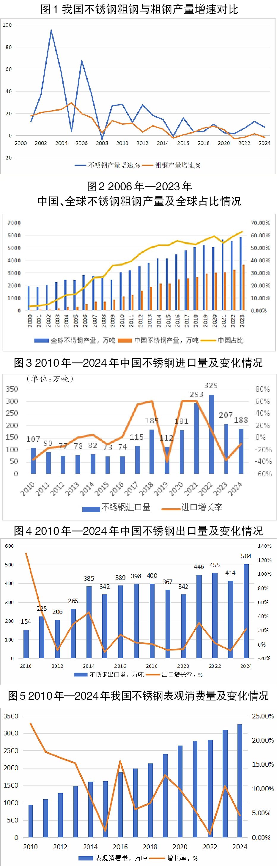 从不锈钢消费情况来看,2010年—2024年,我国不锈钢表观消费量整体呈上升趋势,从2010年的940万吨增长到了2024年的3249万吨,2024年同比增长了4.5%(详见图5)。2024年,我国人均不锈钢表观消费量23千克,已高于部分发达国家水平,但与韩国、意大利人均25千克~40千克的水平相比,仍有增长空间。