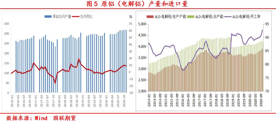 今年前11个月,国内电解铝累计产量为3381.7万吨,同比增加4.0%。从月度数据上看,电解铝产量增加主要集中在7、8两月。据阿拉丁数据显示,截至今年10月,国内电解铝建成产能4202万吨,在产产能3896.6万吨,产能利用率为92.7%,已经处于历史高位,这意味着未来想要继续提高电解铝产量,只能依靠新增产能投放。