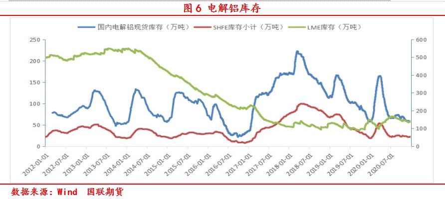 为了节约加工成本,电解铝生产企业与下游加工企业往往建造得很近,这样铝厂可以直接给下游加工企业提供铝水,免去了铸锭再熔融的成本。因此,在下游需求较好时,铝厂生产的铝锭数量并不多,电解铝库存自然难以持续增加。
