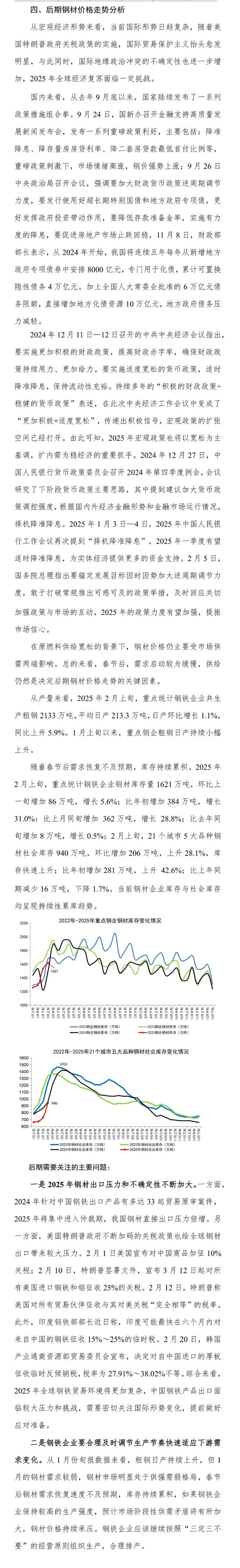 1月份,国内钢材市场进入传统淡季,钢材价格延续窄幅震荡走势。进入2月份,尤其是春节后下游需求启动缓慢以及即将召开的全国两会带来的宏观预期逐渐升温等多重因素的交织下,钢材价格呈震荡盘整运行态势。