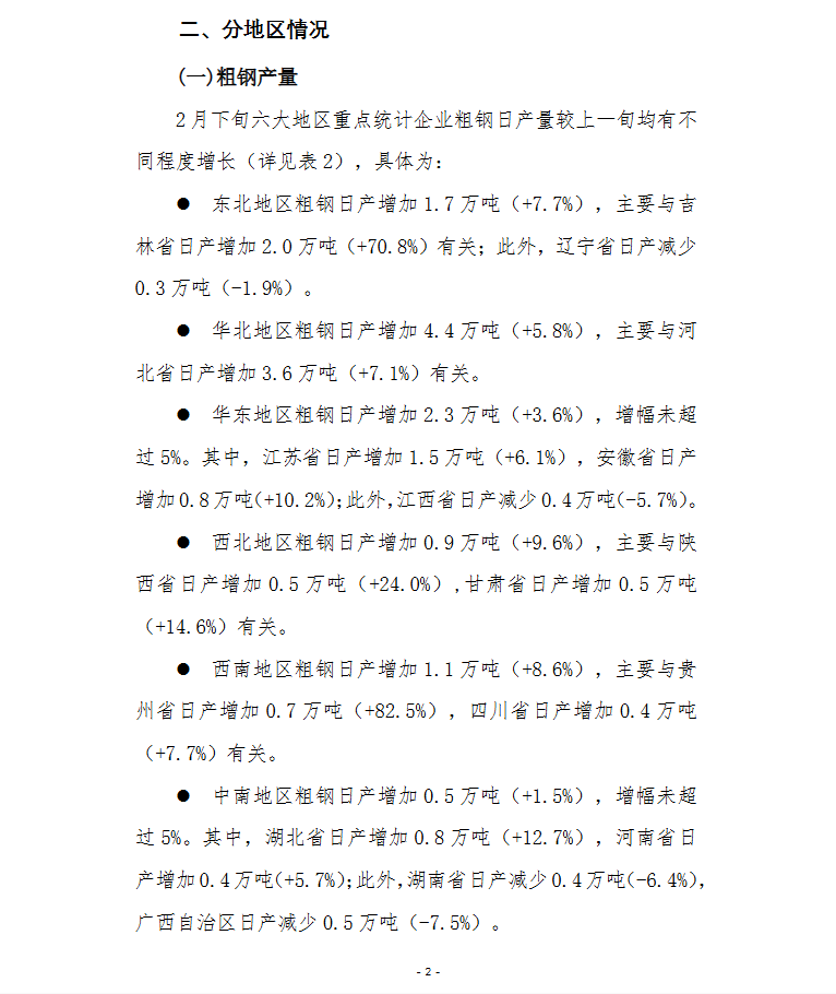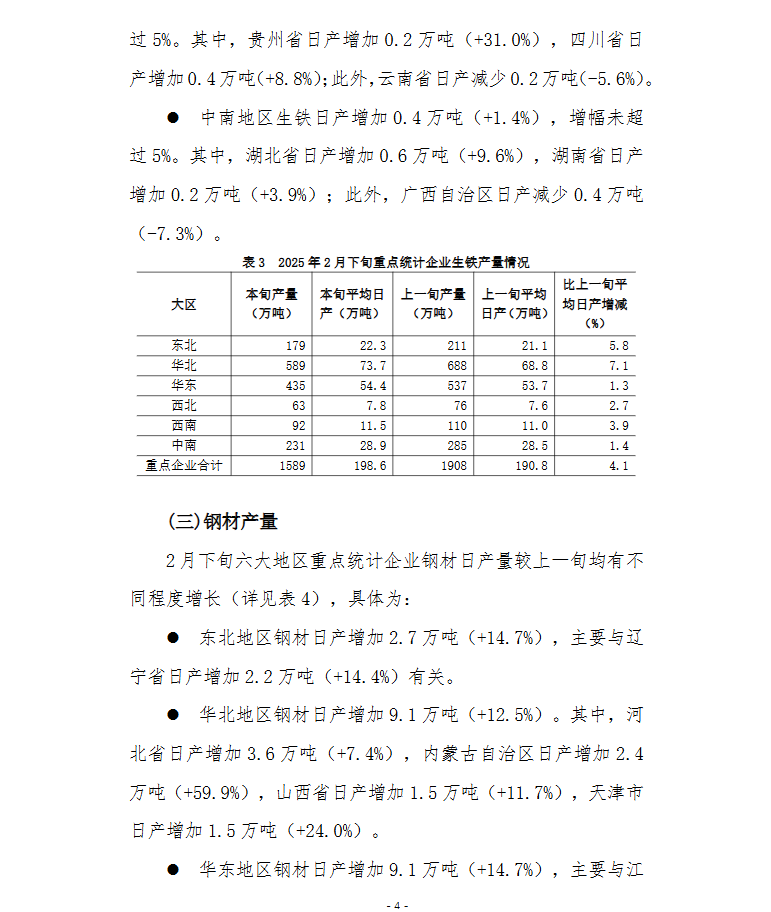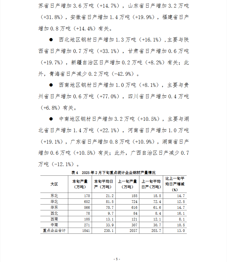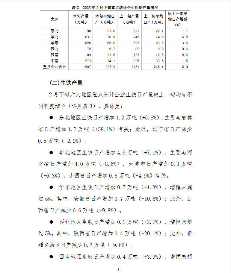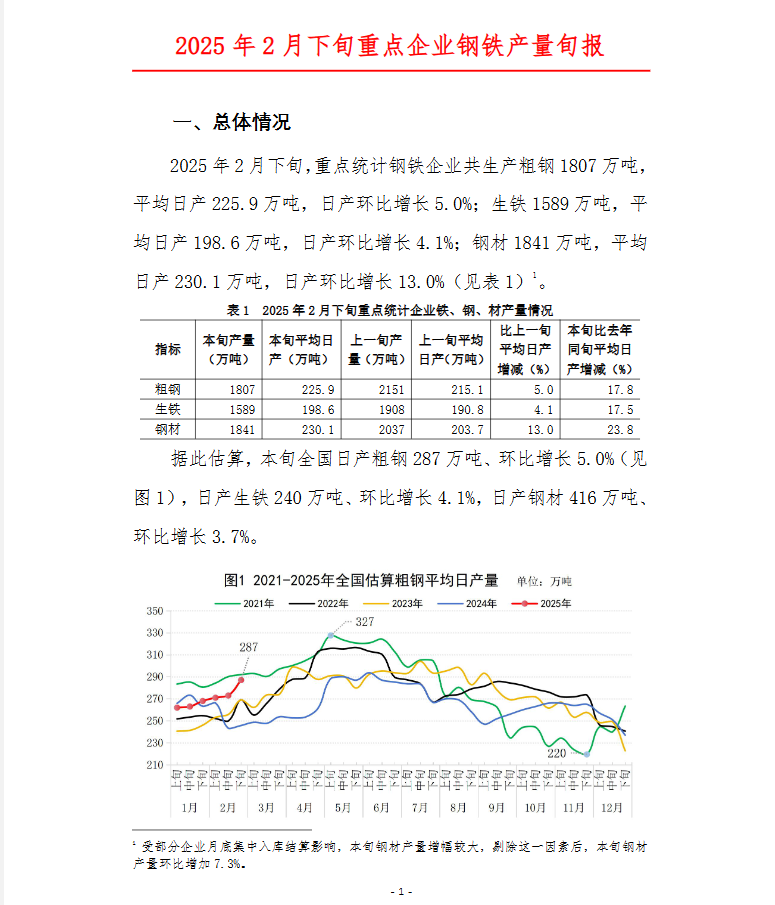 2025年2月下旬,重点统计钢铁企业共生产粗钢1807万吨,平均日产225.9万吨,日产环比增长5.0%;生铁1589万吨,平均日产198.6万吨,日产环比增长4.1%;钢材1841万吨,平均日产230.1万吨,日产环比增长13.0%。
