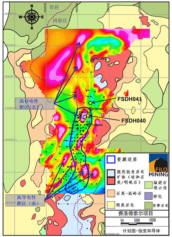 2019/2020年的钻探表明,矿床向北延伸潜力很大,见矿超过1000米,而且深部尚未穿透。2020/2021年的钻探计划目标是验证矿体向北延伸情况。地表数据表明,费洛德索尔矿床向北延伸至少2000米,公司计划在该地区钻探,深度至少达到1000米。