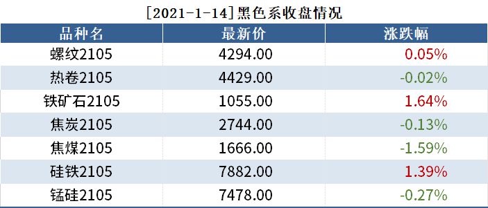截至1月14日收盘,螺纹2105收4294,涨0.05%;热卷(4429, -1.00, -0.02%)2105收4429,跌0.02%;铁矿(1055, 17.00, 1.64%)石2105收1055,涨1.64%。