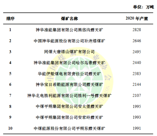 据中国煤炭工业协会统计与信息部初步统计,2020年,全国原煤产量前十名煤矿核定产能共2.8亿吨/年,原煤产量实际完成2.3亿吨,占全国原煤产量约5.9%。