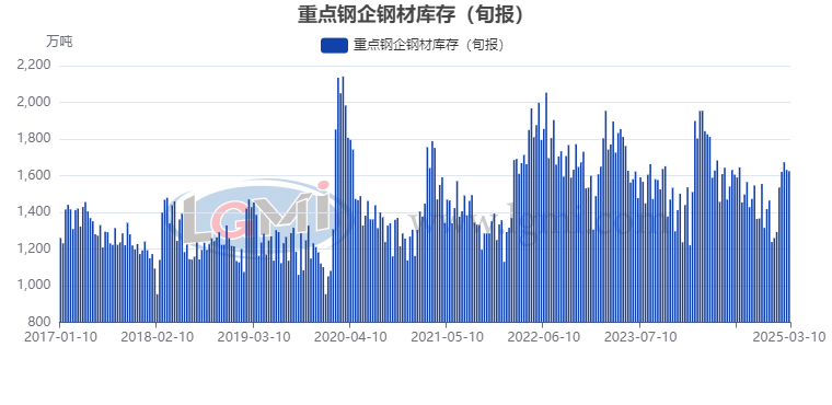 据中国钢铁工业协会统计数据显示,2025年3月上旬重点钢铁企业钢材库存量为1624万吨,旬环比减少7万吨,下降0.4%;比上月同旬增加3万吨,上升0.2%;比去年同旬减少328万吨,下降16.8%。