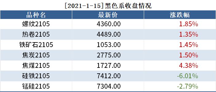 截至1月15日收盘,螺纹2105收4360,涨1.85%;热卷(4489, 60.00, 1.35%)2105收4489,涨1.35%;铁矿(1053, 15.00, 1.45%)石2105收1053,涨1.45%。