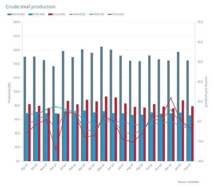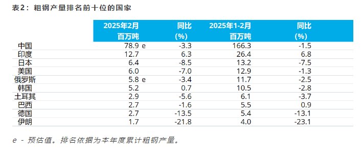 2025年2月全球69个纳入世界钢铁协会统计国家/地区的粗钢产量为1.447亿吨,同比下降3.4%。