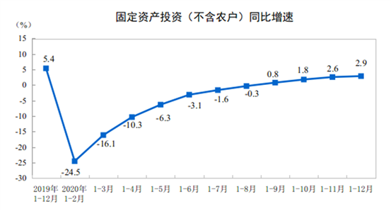 2020年1-12月份,全国固定资产投资(不含农户)518907亿元,比上年增长2.9%,增速比1-11月份提高0.3个百分点。其中,民间固定资产投资289264亿元,增长1.0%,增速提高0.8个百分点。从环比速度看,12月份固定资产投资(不含农户)增长2.32%。