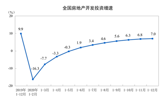 2020年1-12月份,全国房地产开发投资141443亿元,比上年增长7.0%,增速比1-11月份提高0.2个百分点,比上年回落2.9个百分点。其中,住宅投资104446亿元,增长7.6%,增速比1—11月份提高0.2个百分点,比上年回落6.3个百分点。