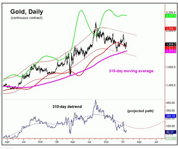 未来数月黄金预计还将保持近期的震荡格局,因为154天和310天周期上都有相关的迹象可寻。其中154天周期上,价格可能已经在11月见底,因均线开始掉头向上,然而310天周期上,均线依然处于下行节奏中,并且看起来将持续至4月份。两者对比图可以看如下所示: