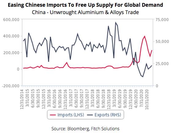 随着国内铝需求在2021年下半年放缓,中国铝进口将在未来几个季度恢复到疫情前的水平。尽管惠誉预计,2021年中国的GDP将出现强劲增长,但它预测,政府消费将是唯一的GDP支出类别,2021年的增长将低于2020年。这是因为外界预计,中国可能会撤回任何额外的刺激措施,将努力重心重新放在遏制债务水平上,可能会防止未来国内铝需求飙升。