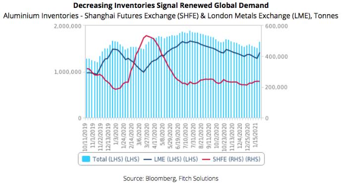 在2020年10月23日至2021年1月22日期间,中国上海期货交易所(SHFE)的铝库存下降0.6%,而LME的铝库存下降4.2%。LME库存此前在2020年1月底至9月底期间增加了14.7%,极有可能是受疫情对制造业和基础设施铝需求的影响。