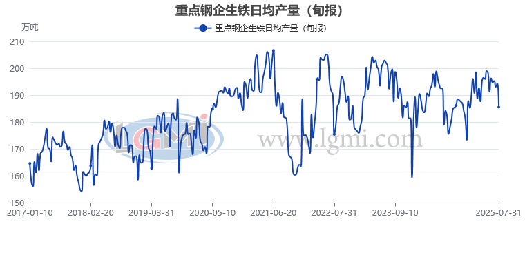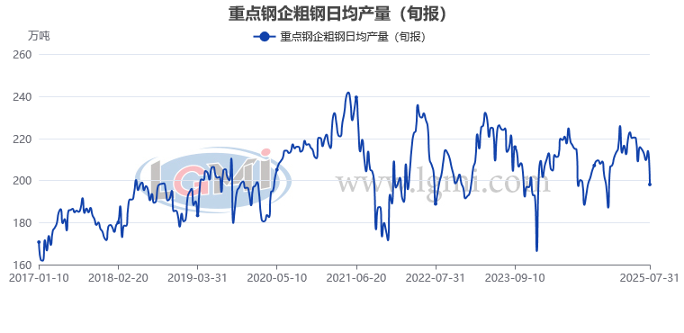 据中国钢铁工业协会统计数据显示,2025年7月下旬重点钢企生铁日均产量185.6万吨,旬环比下降4.5%,同比下降5.8%;7月下旬重点钢企粗钢日均产量198.2万吨,旬环比下降7.4%,同比下降8.7%;7月下旬重点钢企钢材日均产量209.1万吨,旬环比上升0.5%,同比下降4.0%。
